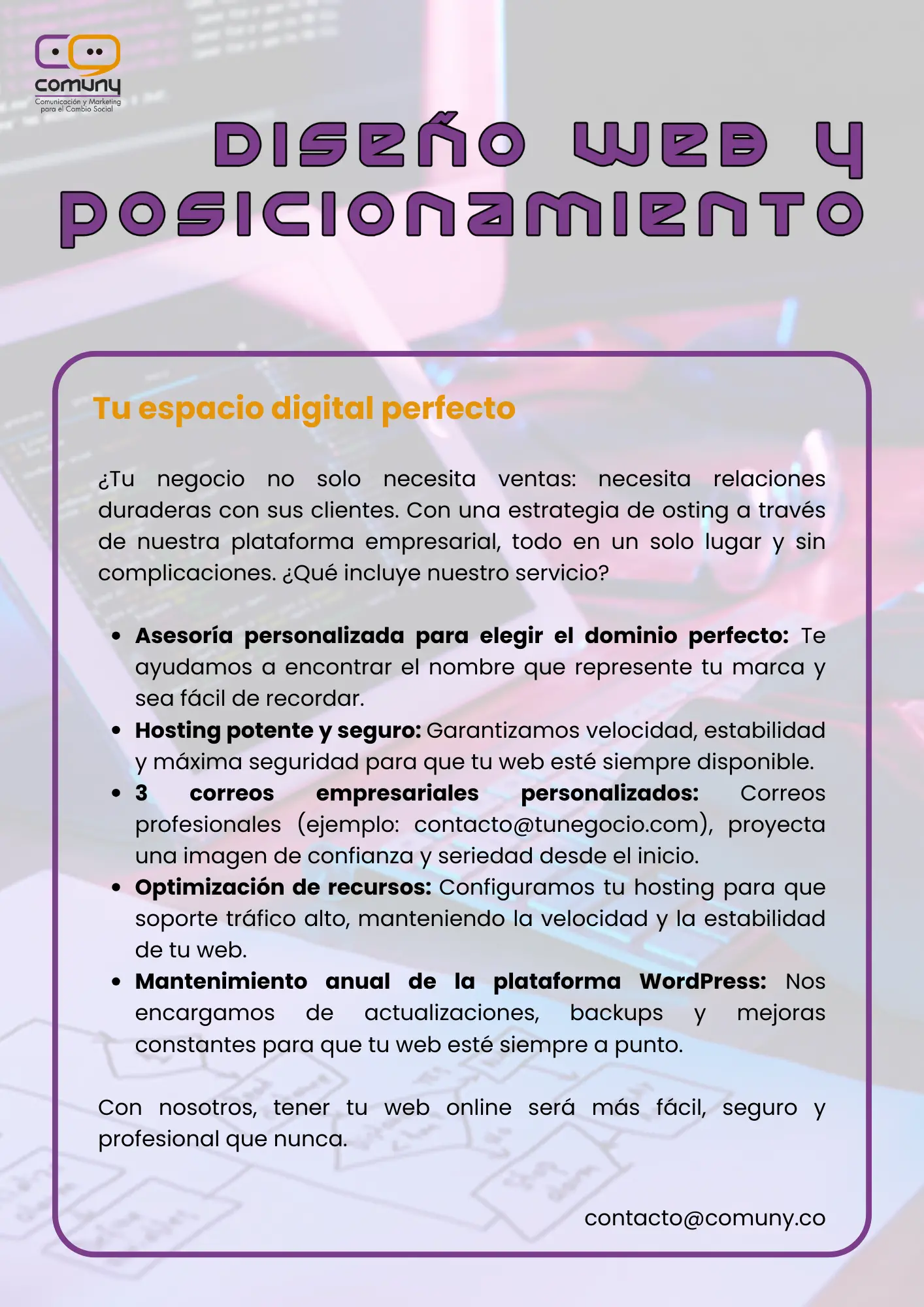 Ofrecemos correos empresariales personalizados para proyectar una imagen de confianza y seriedad desde el inicio y, el mantenimiento anual de tu plataforma WordPress.