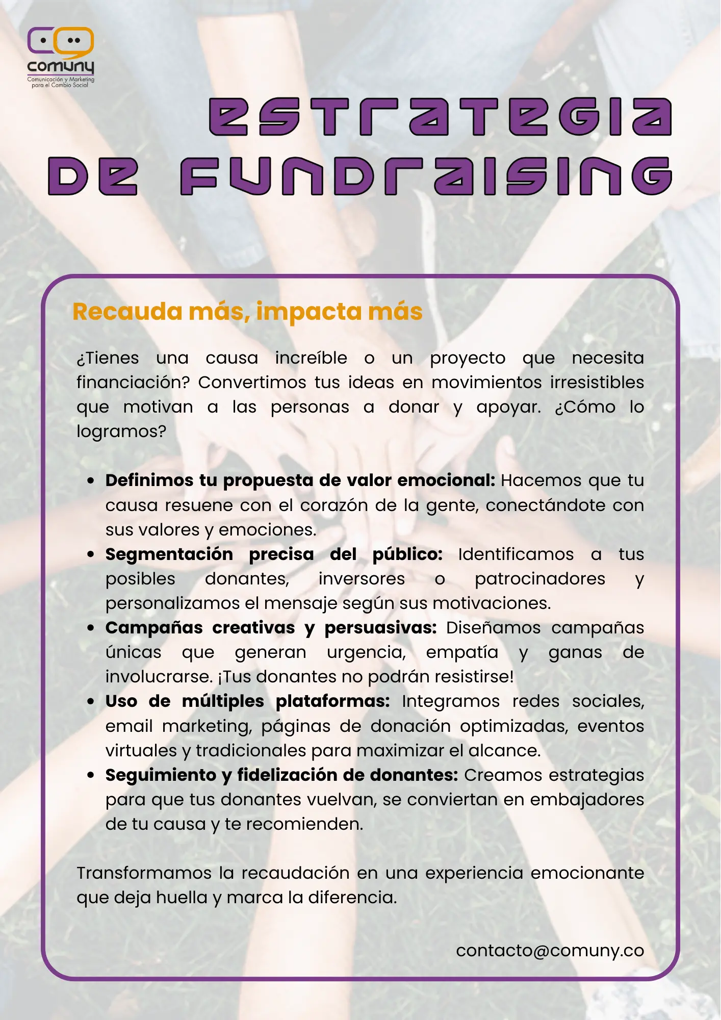 Convertimos tu causa en un movimiento poderoso conectando con las emociones y valores de las personas para inspirarlas a donar y apoyar.