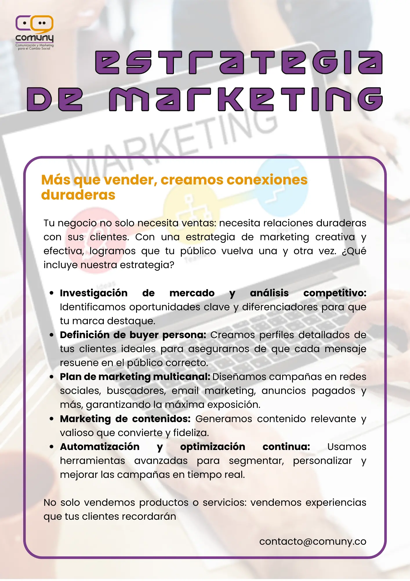 Tu negocio no solo necesita ventas: necesita relaciones duraderas con sus clientes. Con una estrategia de marketing creativa y efectiva, logramos que tu público vuelva una y otra vez.